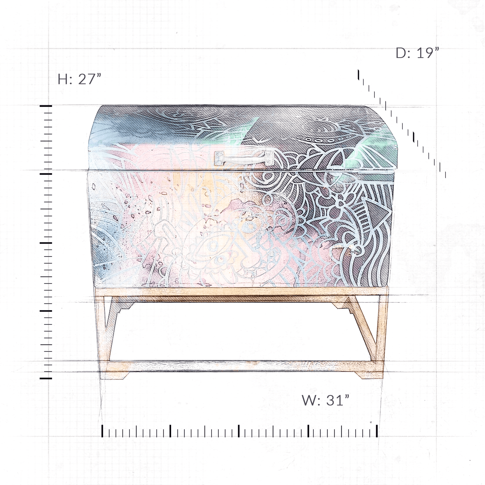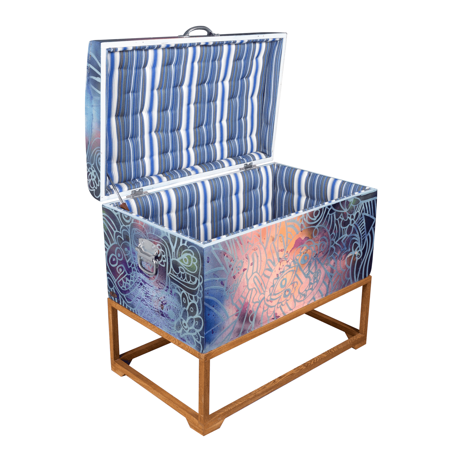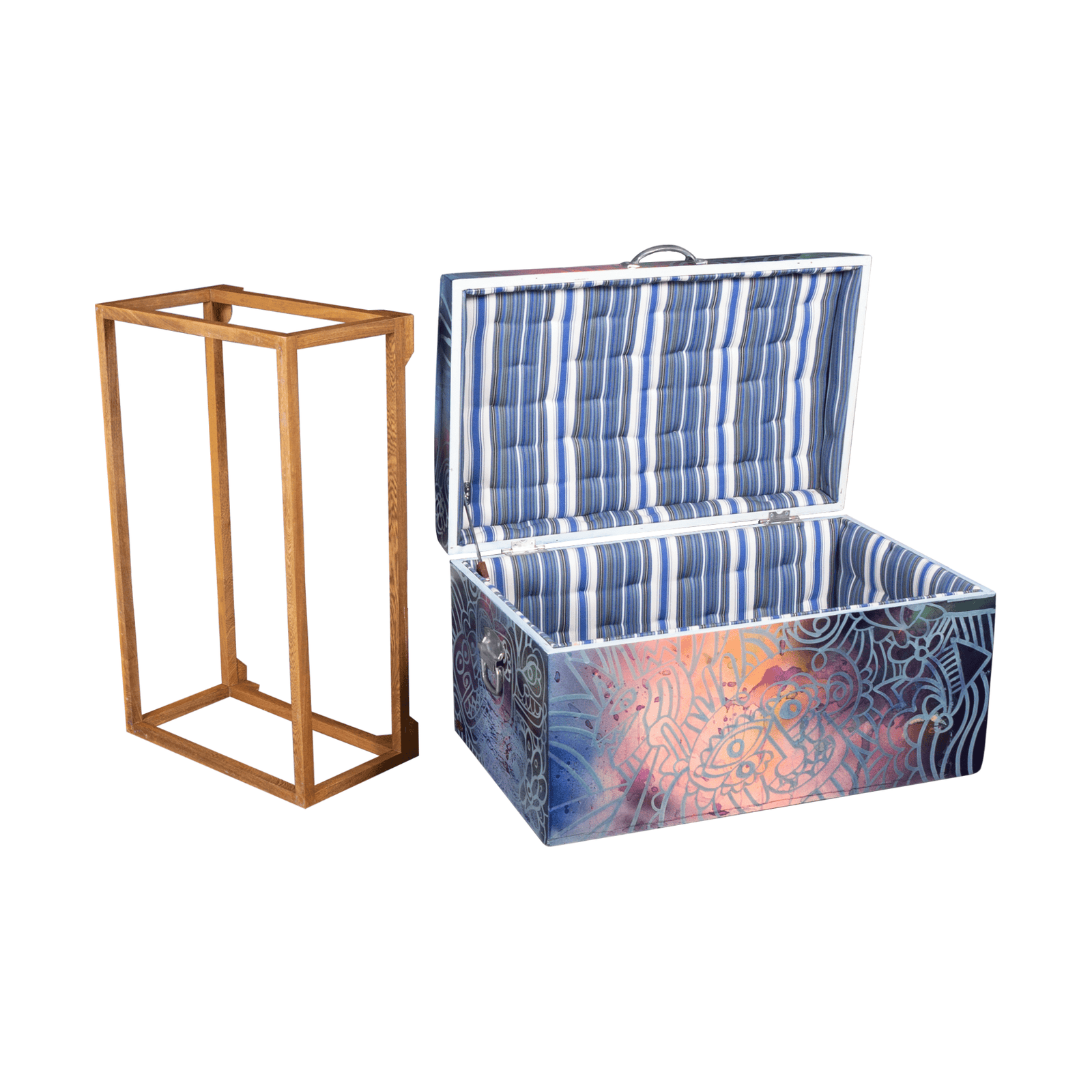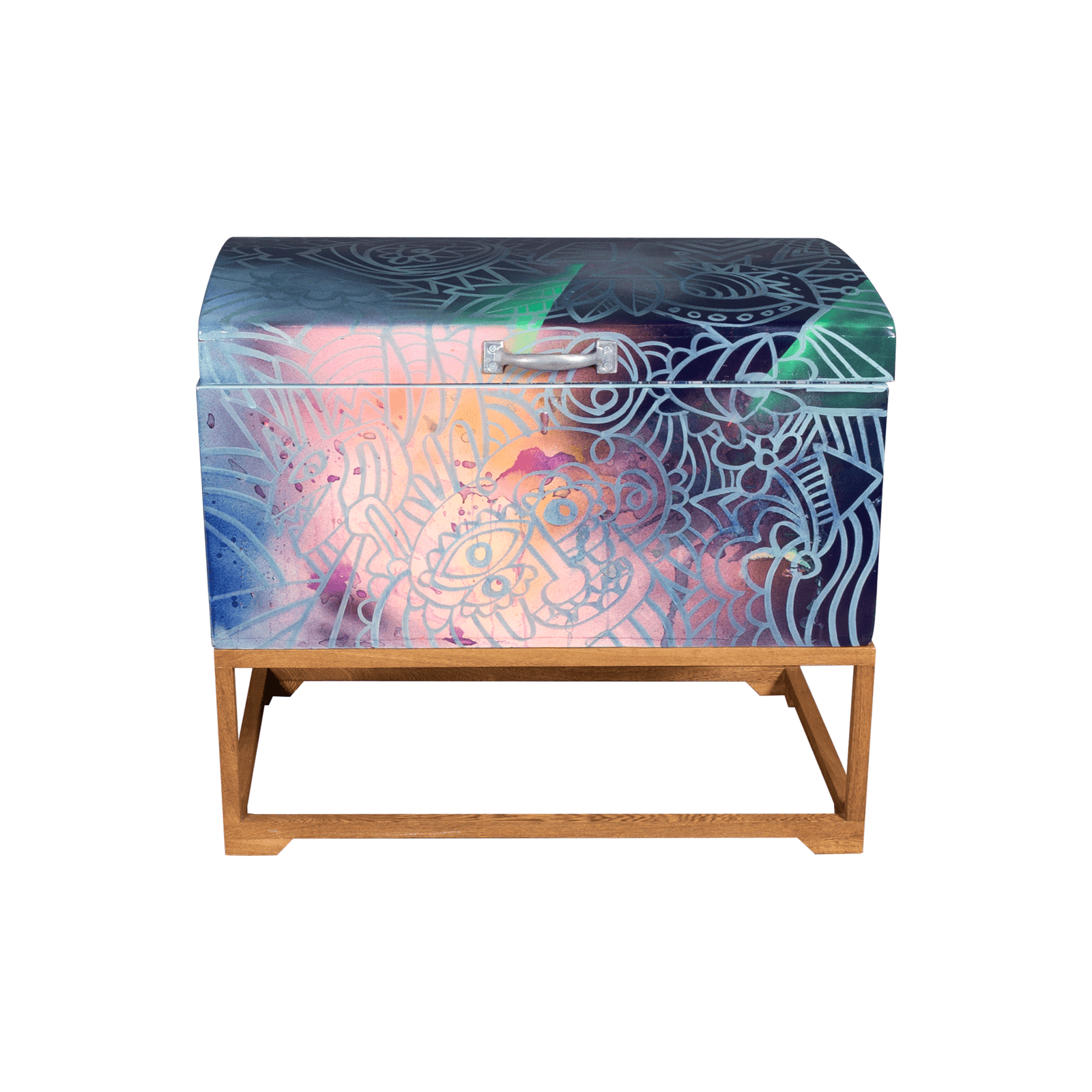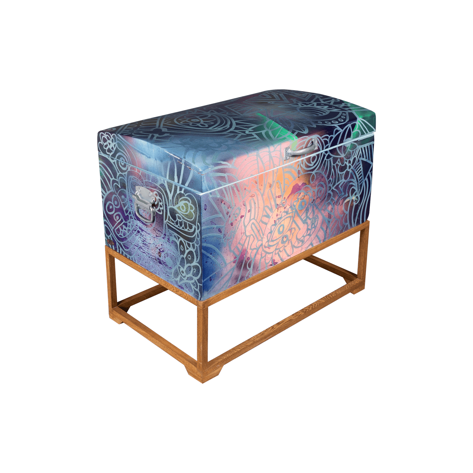 Embrace the vibrant spirit of Colombia with this 1970s storage trunk, meticulously restored and uniquely transformed by a talented Colombian street artist. Adorned with striking graffiti designs, this versatile trunk offers ample storage for everything from blankets and bedding to personal treasures.