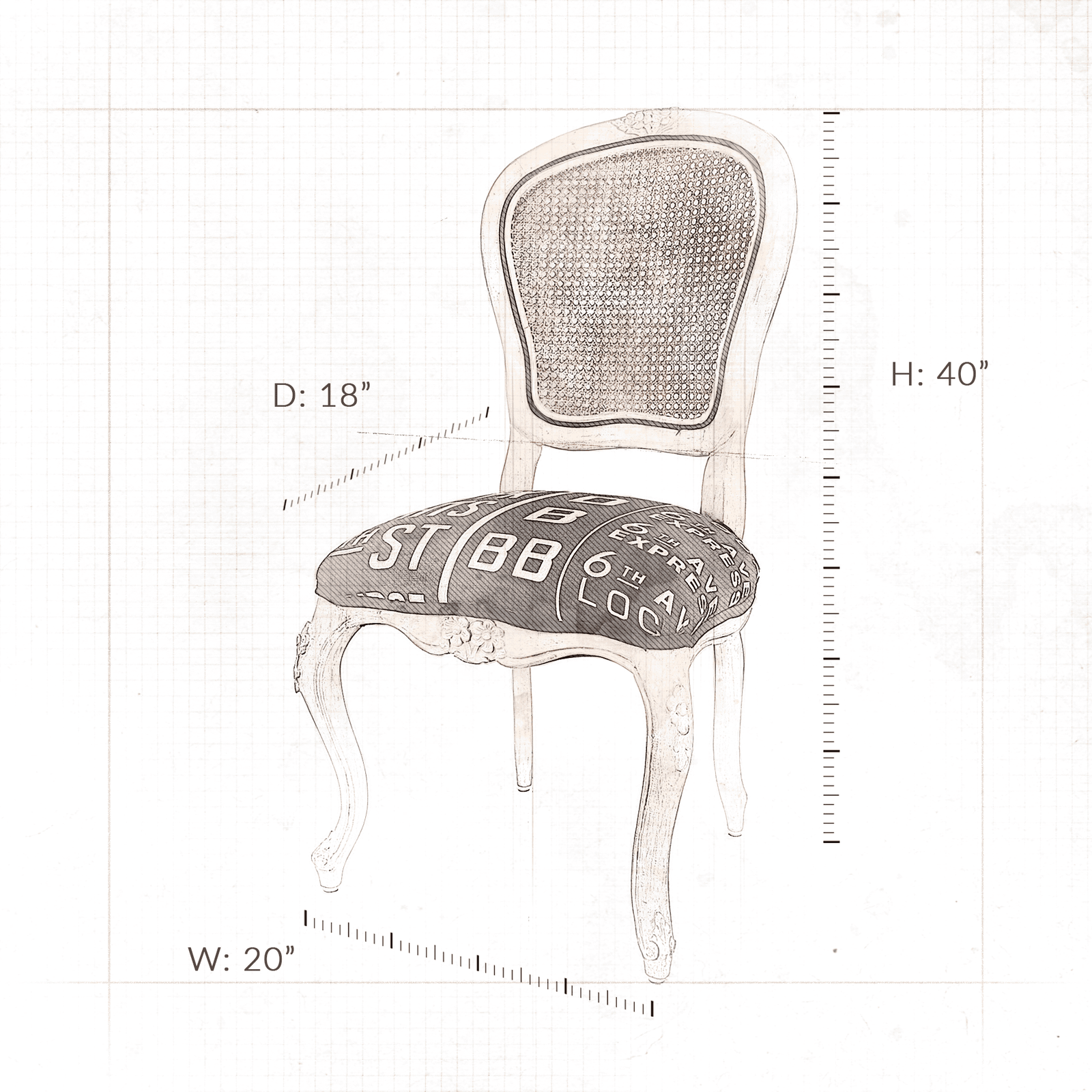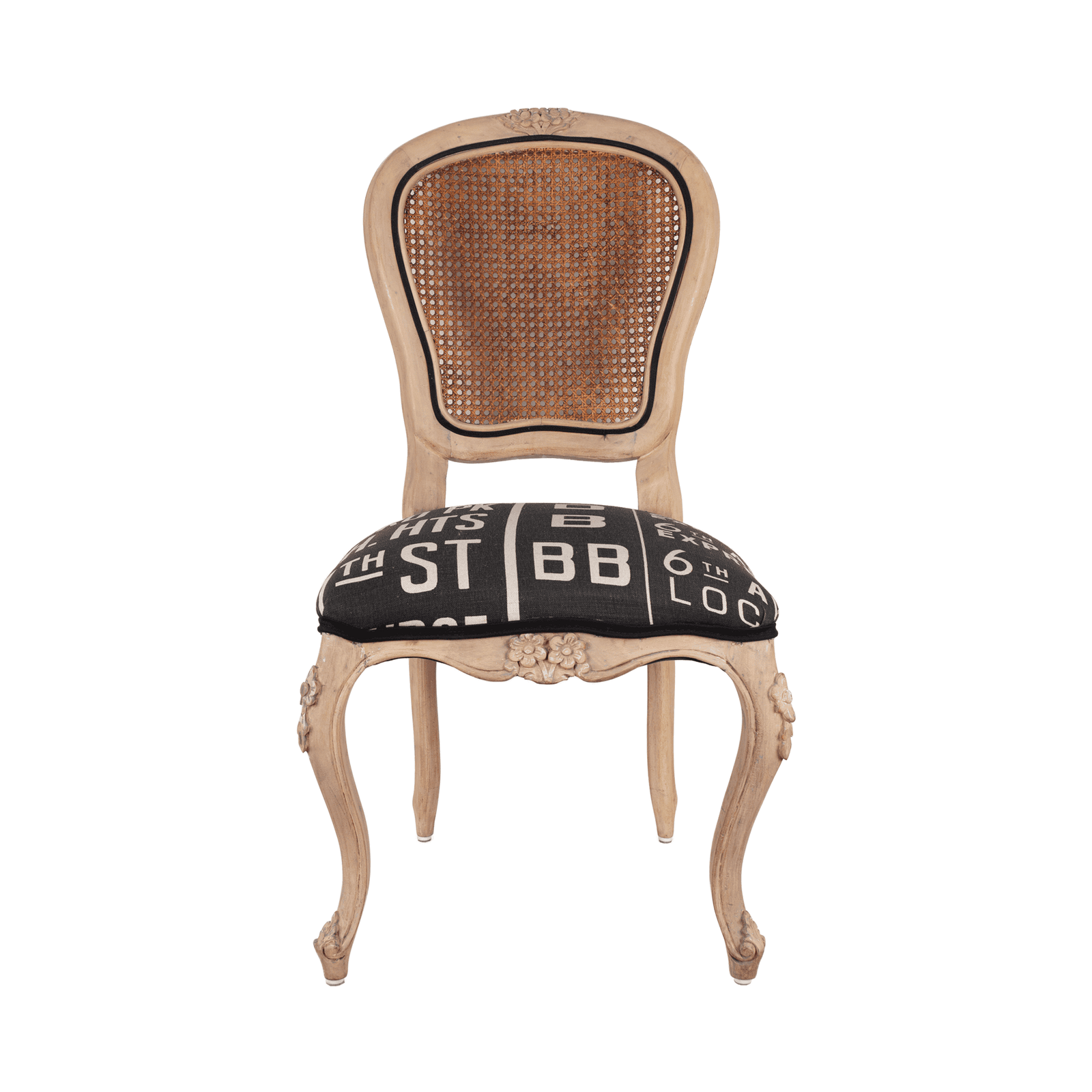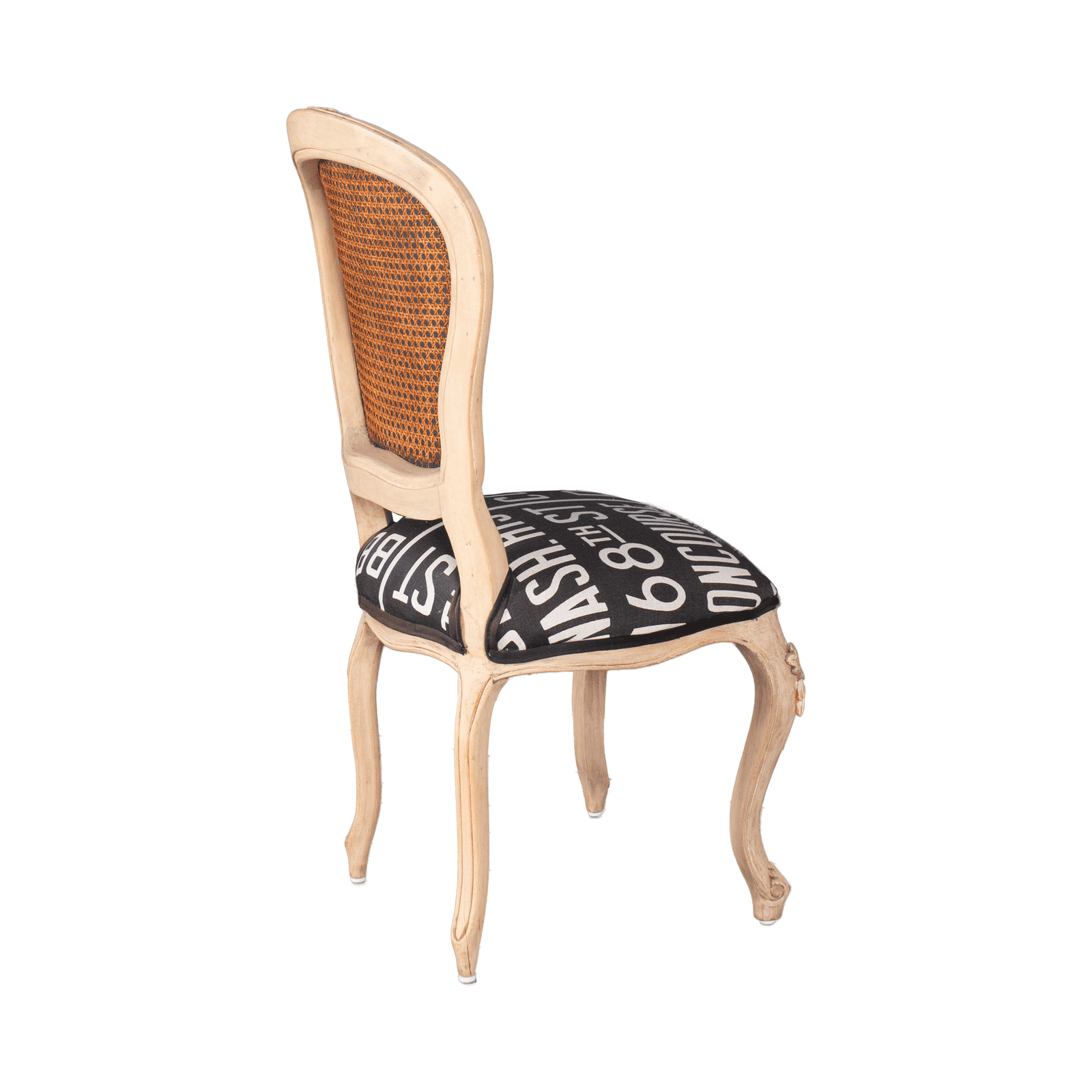 Reinvent and make unique your dining or living space with this exquisite set of 4 restored vintage French Provincial wicker chairs. These chairs seamlessly blend classic design with a contemporary twist. The original wicker backs, intricately woven and beautifully preserved, add a touch of timeless elegance, while the modern upholstery, featuring a bold black-and-white subway sign motif, infuses the chairs with urban chic flair.