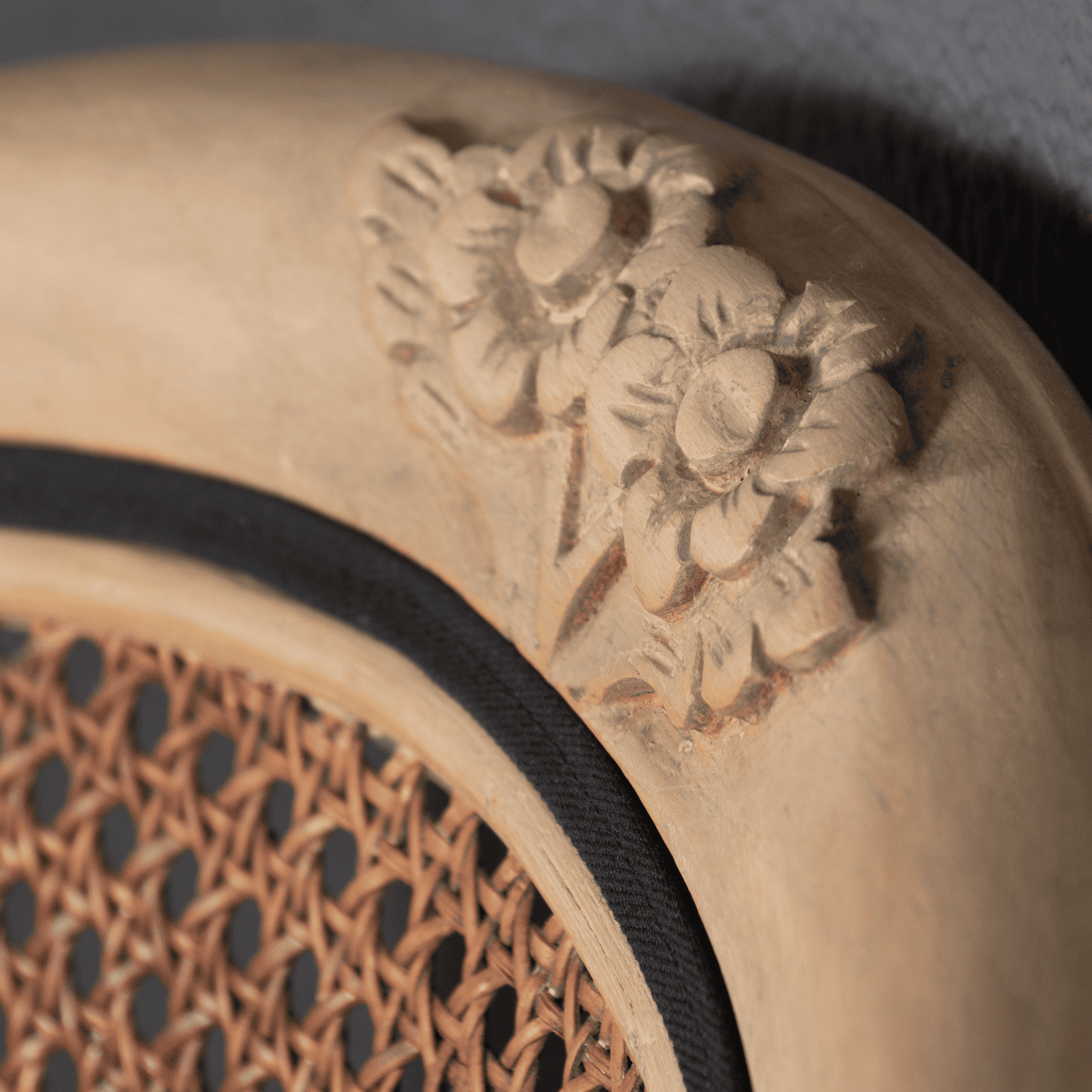 Each chair boasts a sturdy wooden frame with delicate carved details, finished in a distressed cream color that enhances their vintage charm. The juxtaposition of the traditional wicker and the striking upholstery makes these chairs a unique addition to any eclectic or modern interior.
