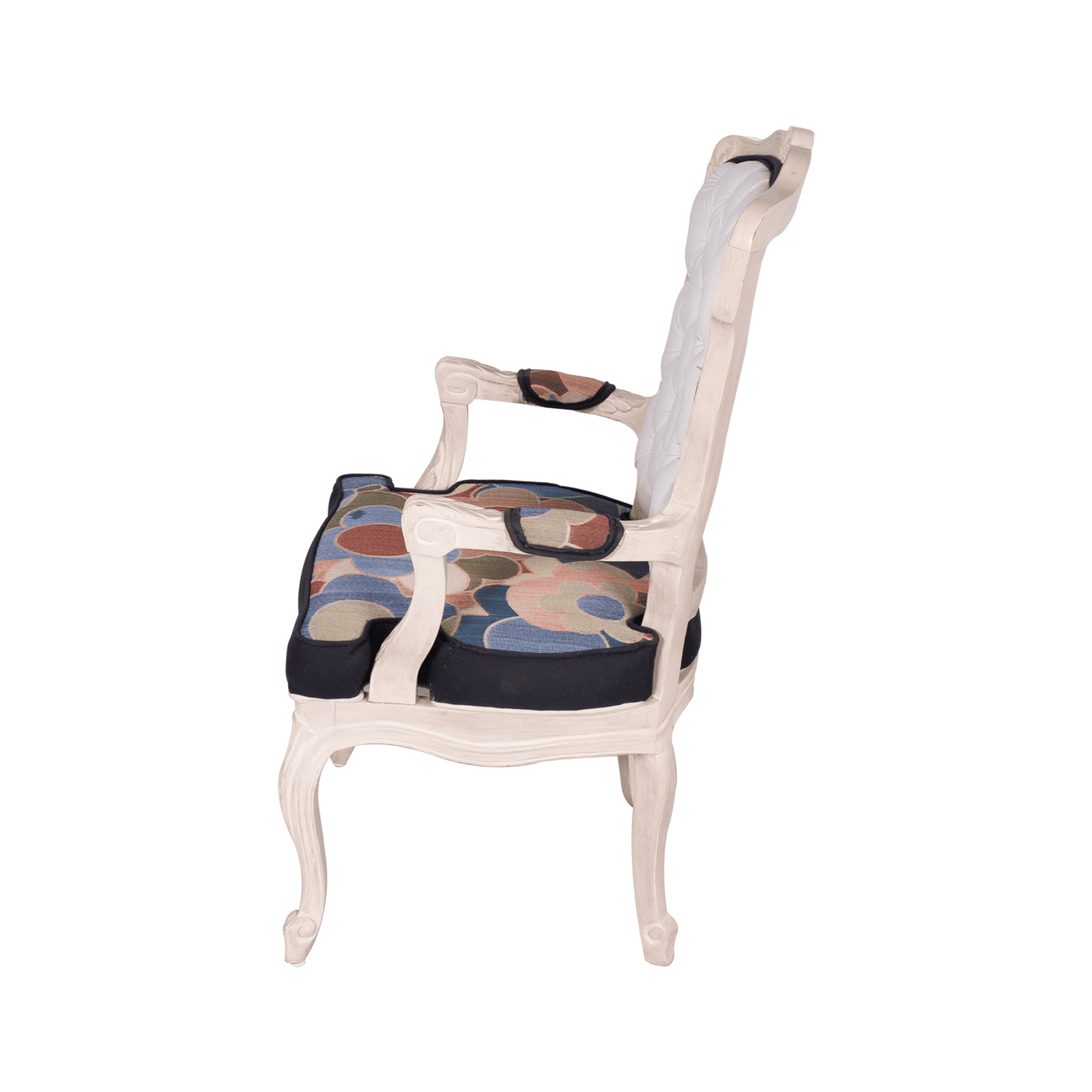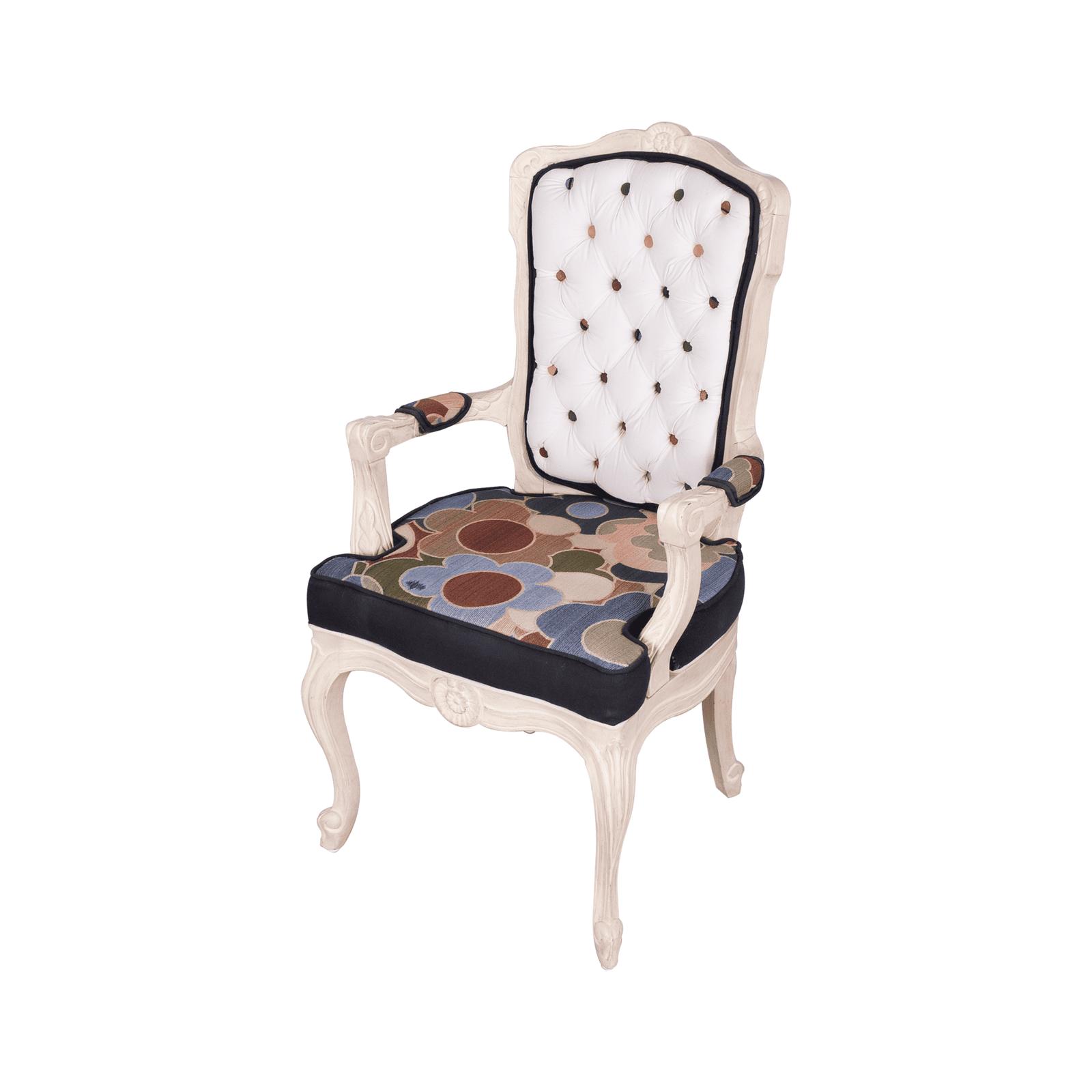 Featuring a white tufted backrest with multicolored buttons, a vibrant floral seat cushion, and intricately carved details, this chair combines traditional elegance with modern flair.