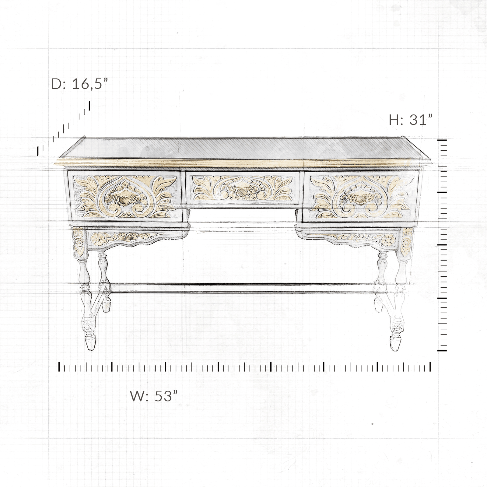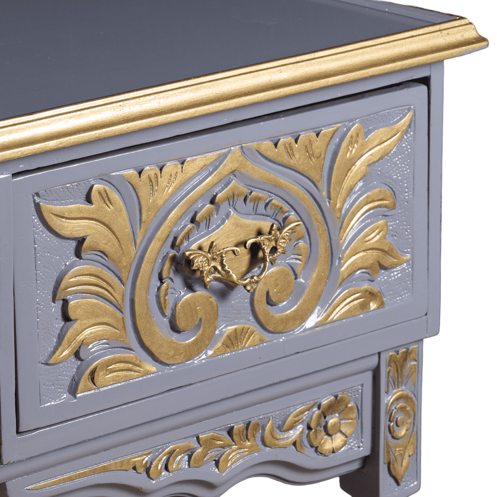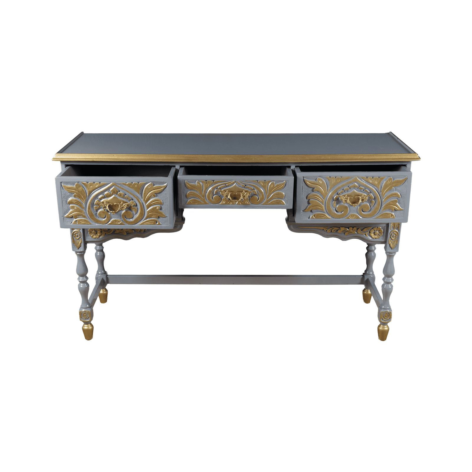 Elevate your workspace with this elegant vintage desk, featuring intricate Baroque-inspired detailing. Painted in a sophisticated grey with gold accents, this desk offers a luxurious touch to any room. Its classic design is complemented by ornate carvings, making it a standout piece for those who appreciate timeless beauty and craftsmanship.