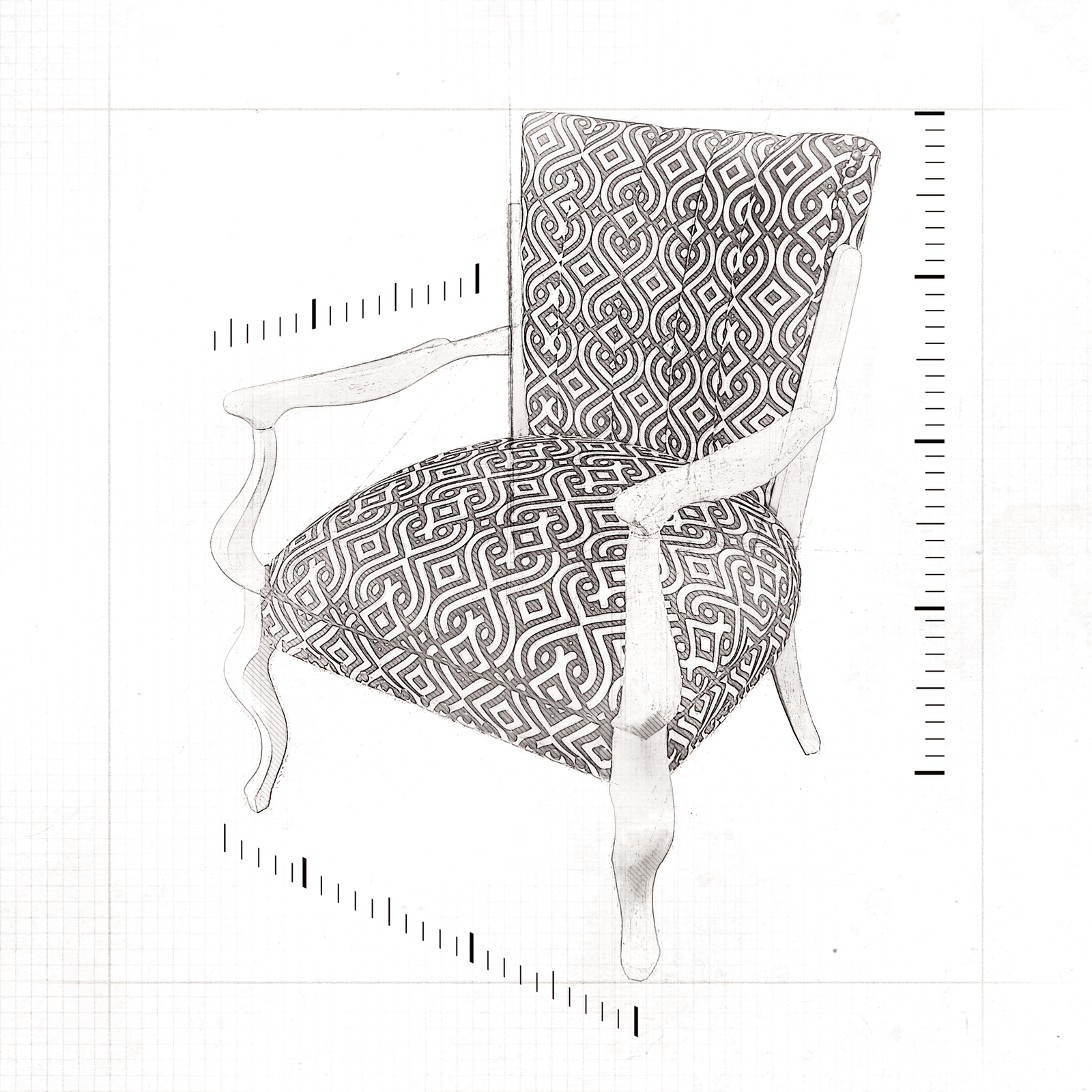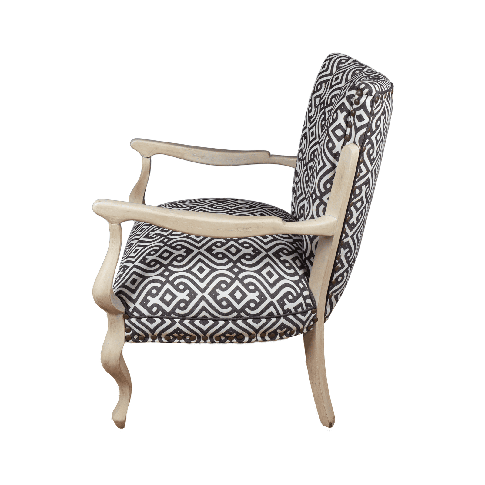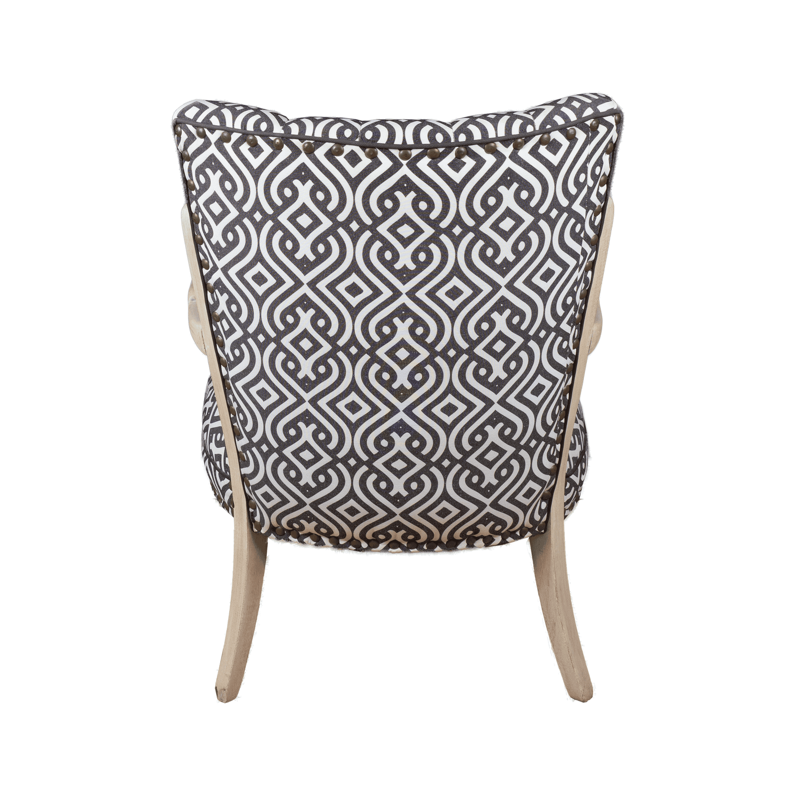 The high backrest and cushioned seat are }upholstered in a striking black and white geometric pattern, making it a standout piece in any room.