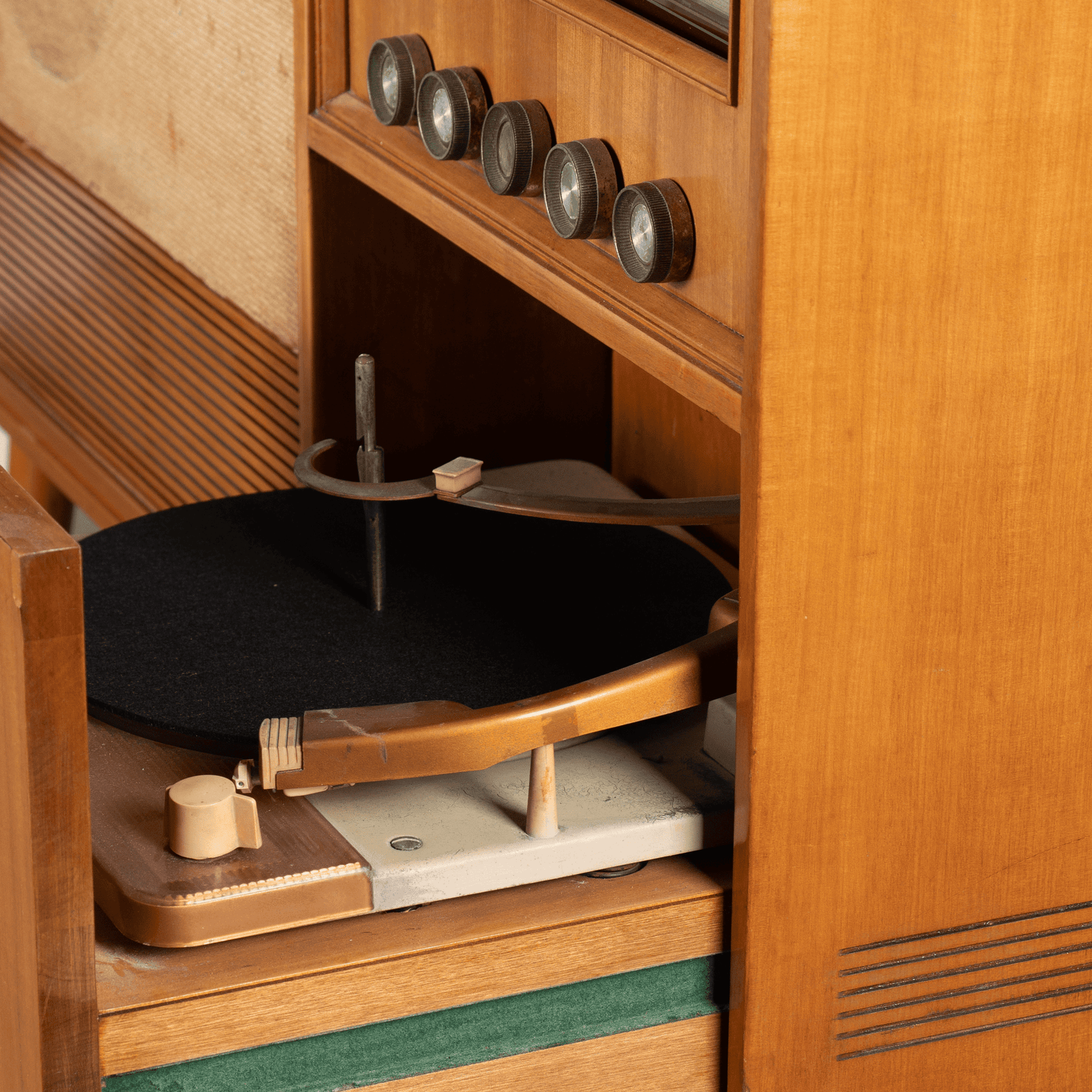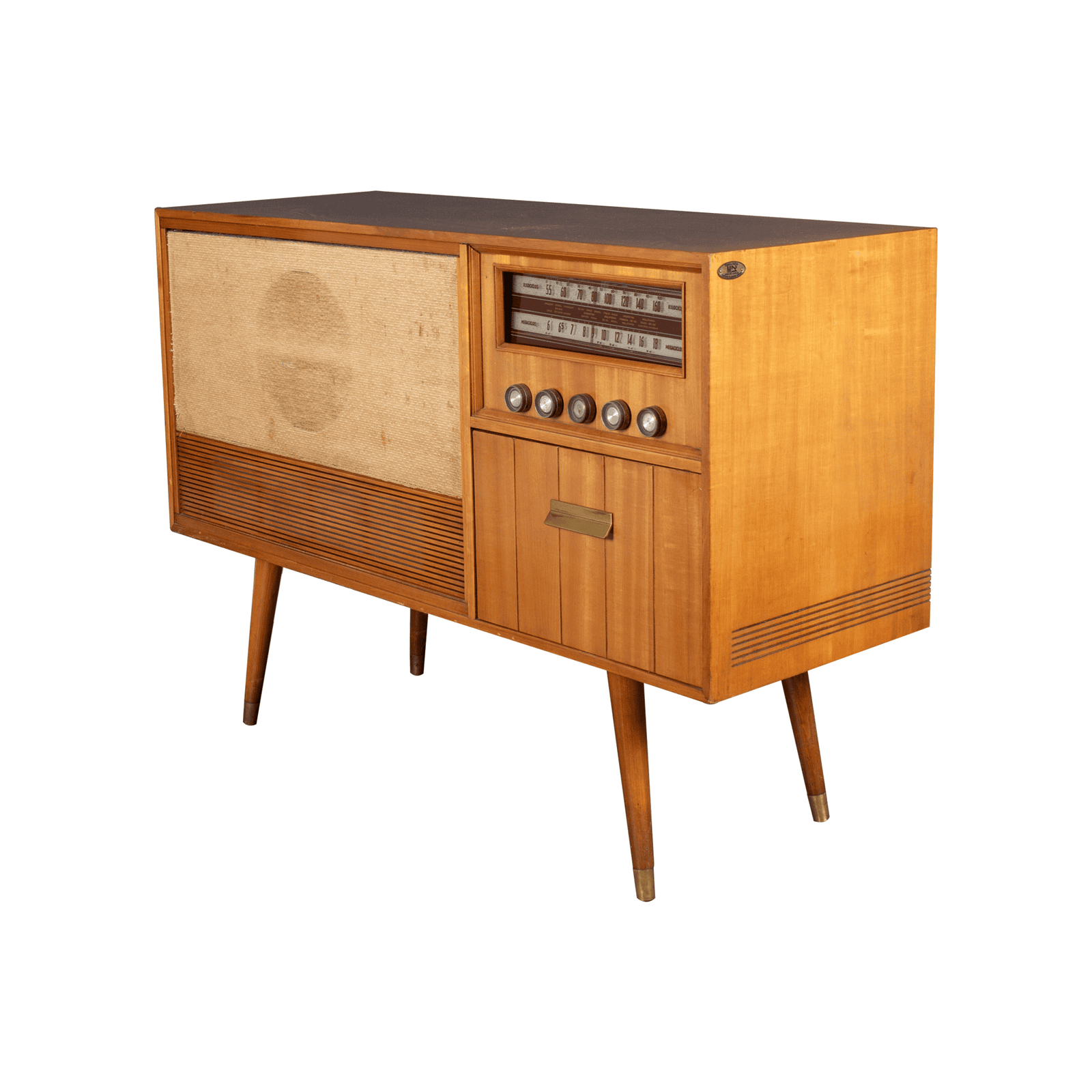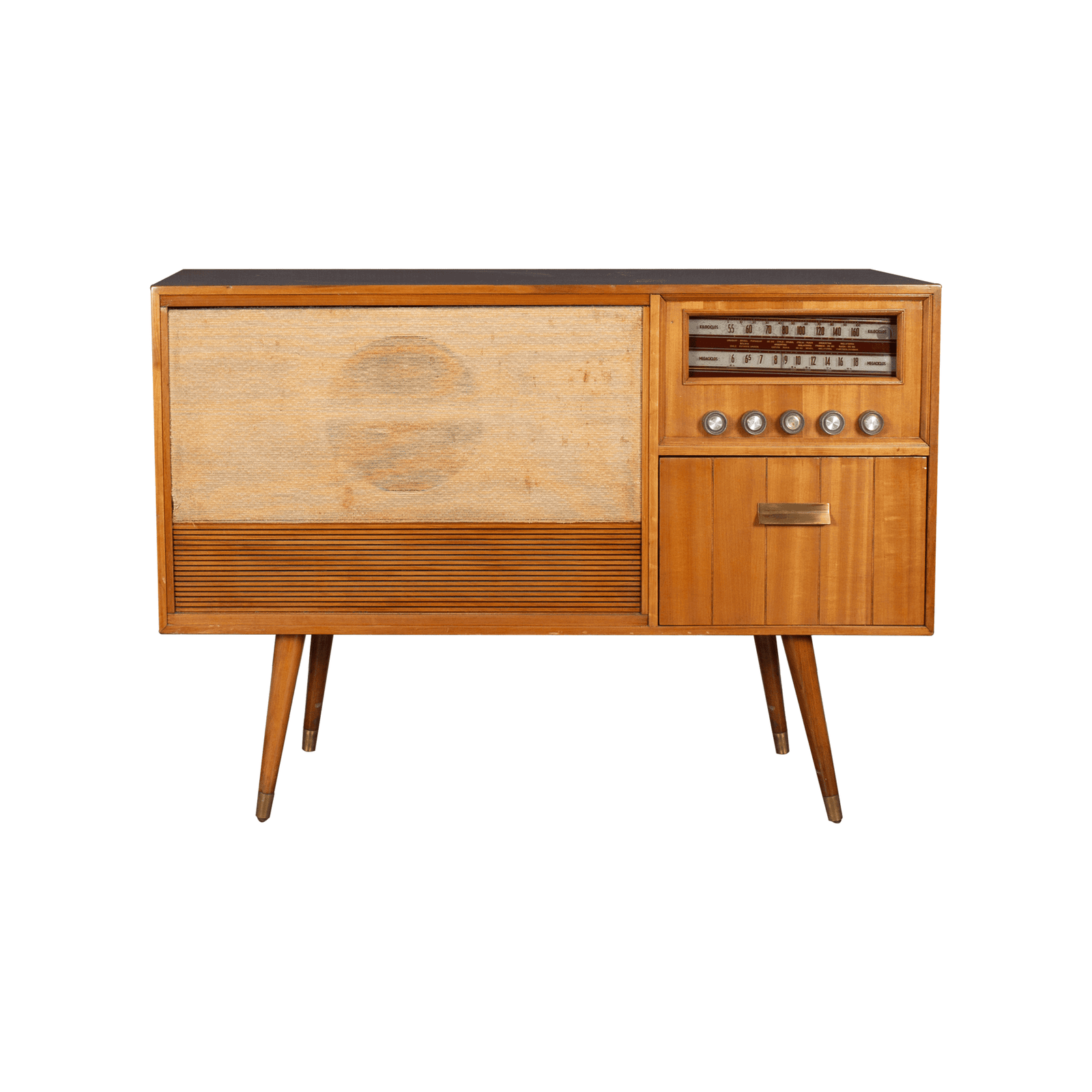 Featuring a wooden cabinet with tapered legs, a woven fabric speaker grille, and a control panel with multiple knobs and a small compartment, this piece is perfect for collectors and enthusiasts of vintage electronics and mid-century modern design. Bring home a piece of history today!